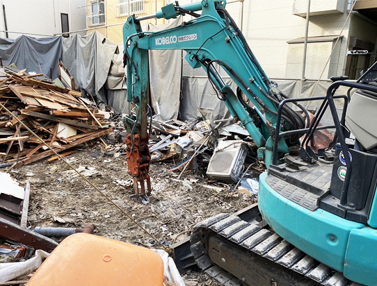 なお、実際の解体工事は躯体の解体、整地の順で行われます。地上躯体のあと、鉄筋コンクリート造などの大規模な解体工事では地下躯体の解体や杭抜き工事を行うことも多々御座います。解体の途中で出る解体材は、建設リサイクル法および廃棄物処理法に準じて適切に分別され、現場より搬出、処理されます。